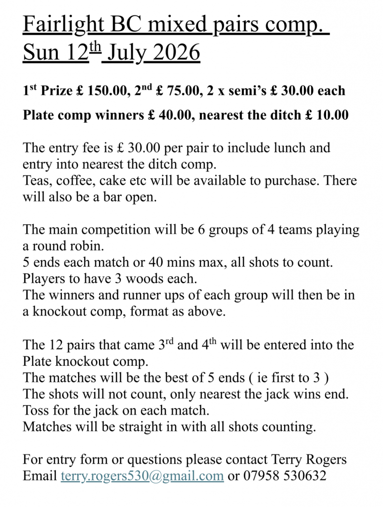 Fairlight BC mixed pairs comp. Sun 12th July 2026